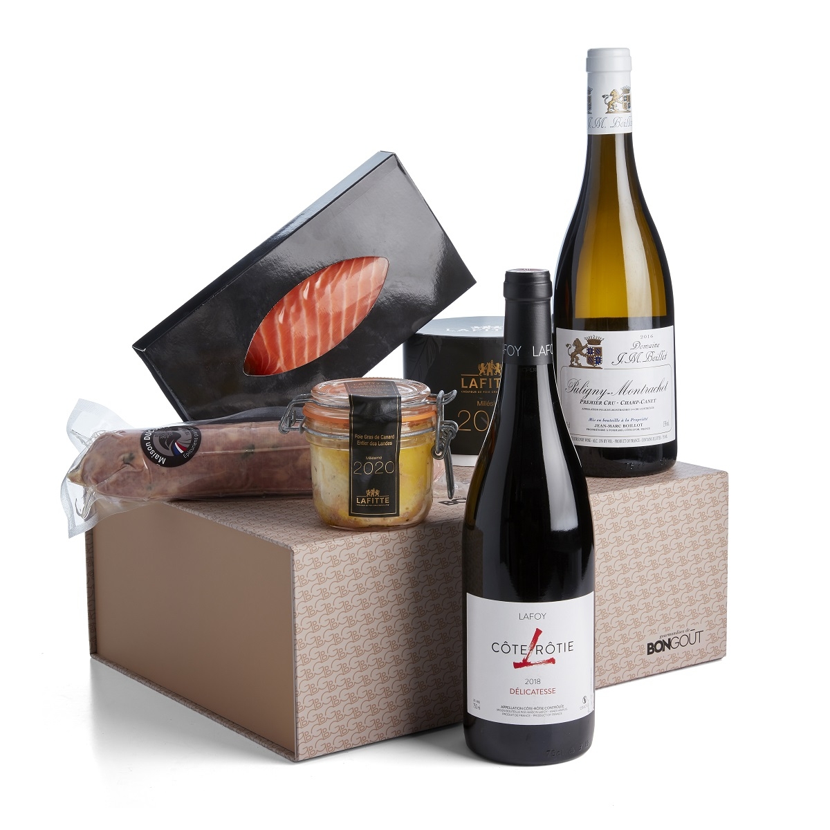 D'une bouteille de Saint Joseph Rouge Vidal Fleury 2021, d'un foie gras entier bocal Maison Lafitte (130gr), d'un jambon Bellota 75% Ibérique Maison BERMAN (100gr), d'un pâté Périgueux truffe et foie gras de canard du Périgord (110gr), d'une pintade aux morilles de la Maison Abel (350gr), et d'un poulet aux morilles de la maison Abel (350gr).