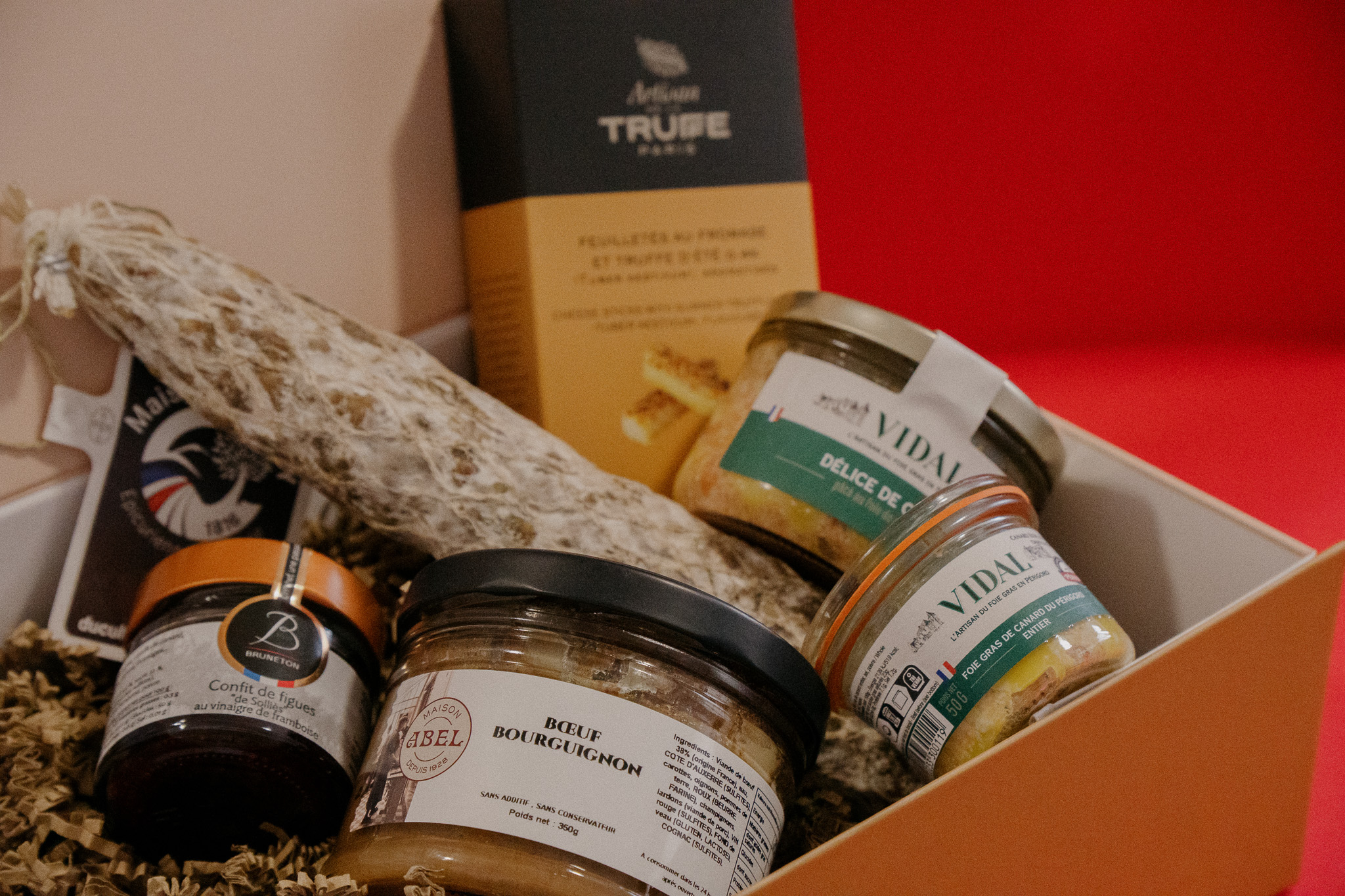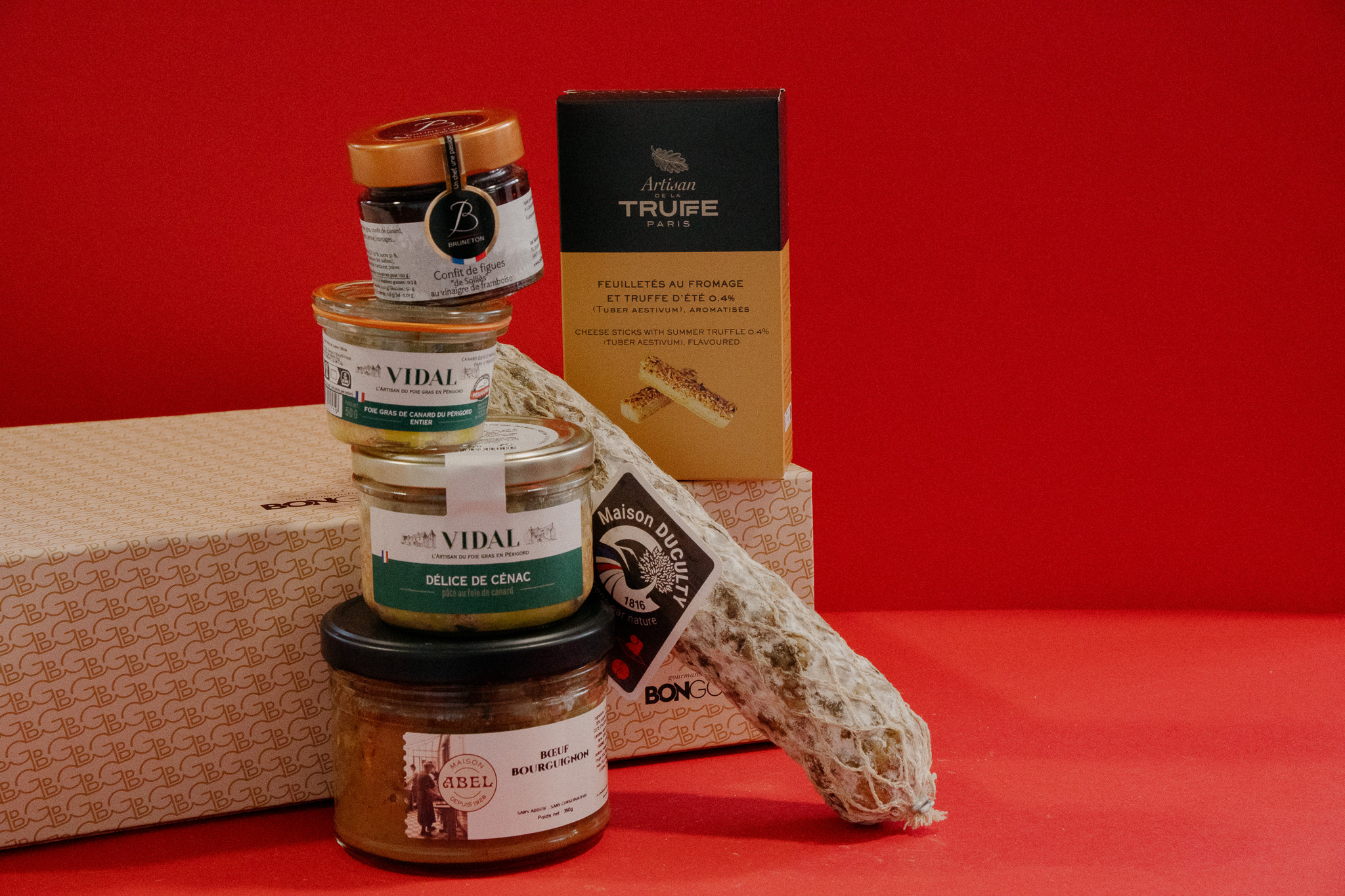 D'un foie gras Entier Maison Vidal en Périgord (50gr), de feuilletés à la truffe d'été (80gr), d'un Déliced de Cénac Maison Vidal en Périgord (170gr), d'une rosette de Lyon - Maison Duculty, d'un bœuf bourguignon de la maison Abel (350gr) et d'un confit de figues Bruneton (100gr).