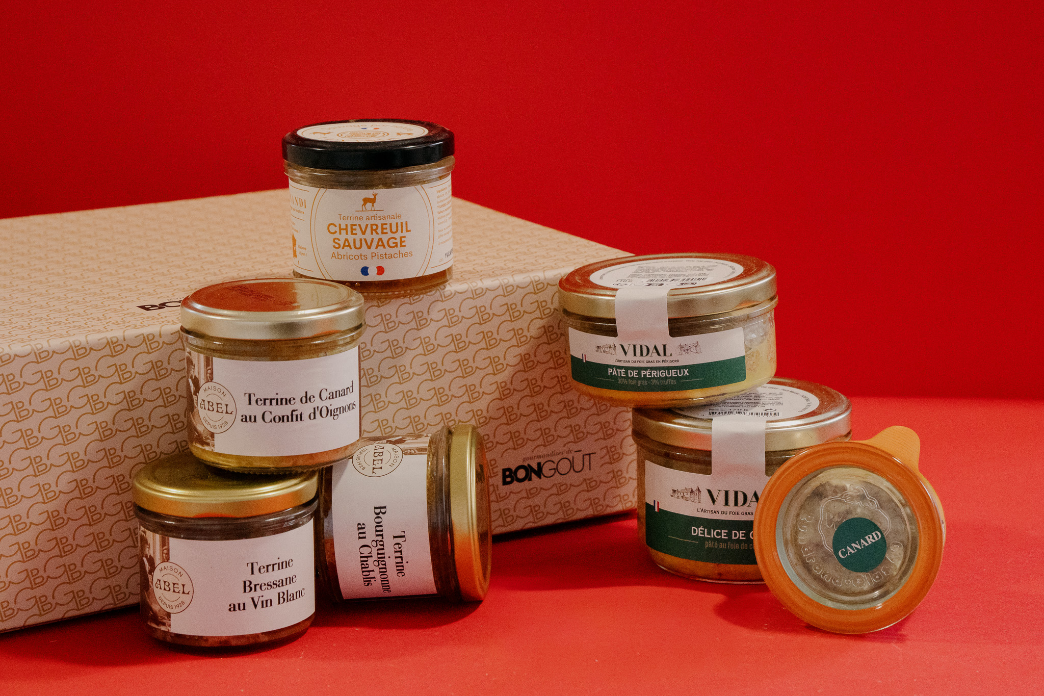 D'un Délice de Cénac Maison Vidal (170gr), d'un pâté Périgueux truffe et foie gras de canard du Périgord (110gr) Maison Vidal, d'une terrine chevreuil & abricots Maison Venandi (90gr), d'un trio terrine de la maison Abel (90gr)