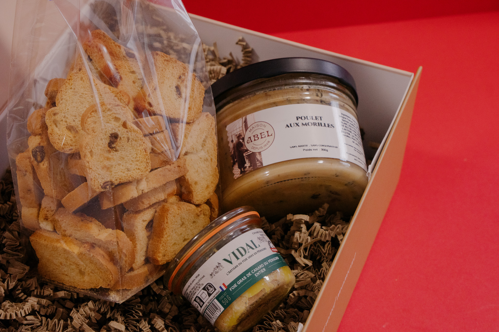 D'un foie gras de canard entier bocal Maison Lafitte (130gr), de toast aux figues la Chanteracoise (140gr), et d'un poulet aux morilles de la maison Abel (350gr).