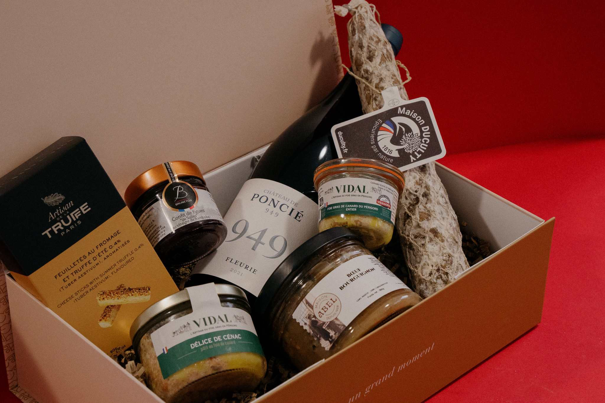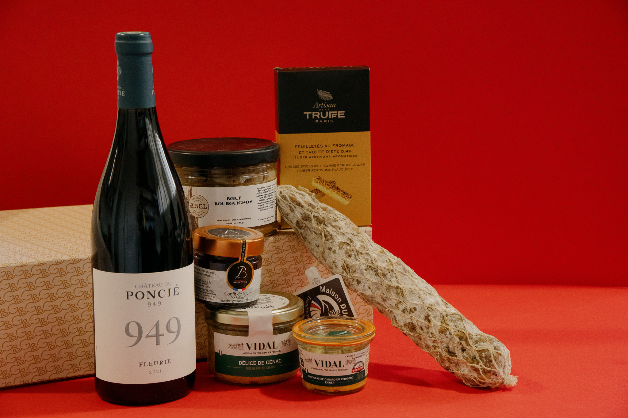 D'une bouteille Fleurie 949 - Château de Poncié rouge 75cl 2022, d'un foie gras entier Maison Vidal Périgord (50gr), de feuilletés à la truffe d'été (80gr), d'un délice de Cénac Maison Vidal en Périgord (170gr), d'une rosette de Lyon - Maison Duculty, bœuf bourguignon de la maison Abel (350gr), confit de figues Bruneton (100gr).