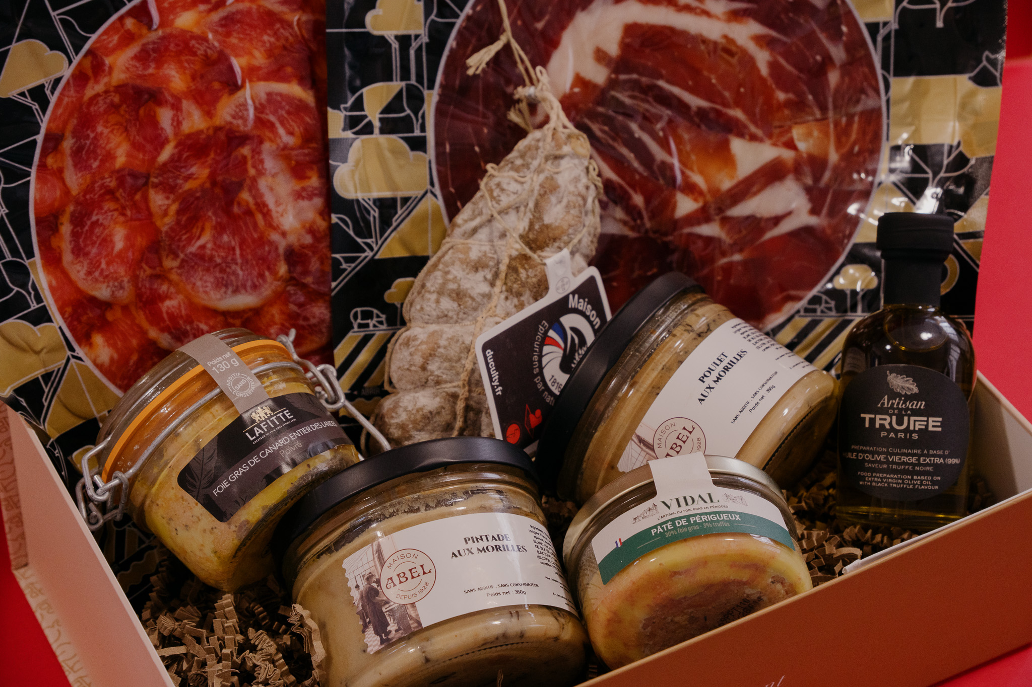 D'un foie gras entier bocal Maison Lafitte (130gr), d'un pâté Périgueux truffe et foie gras de canard du Périgord (110gr), d'une asiette de lomo Ibérique Maison Berman (100gr), d'un jambon Bellota 75% Ibérique Maison BERMAN (100gr), d'un Jesus - Maison Duculty, d'un poulet aux morilles de la maison Abel (350gr), d'une pintade aux morilles de la Maison Abel (350gr) et d'une huile d'olive à la truffe d'été (100ml).