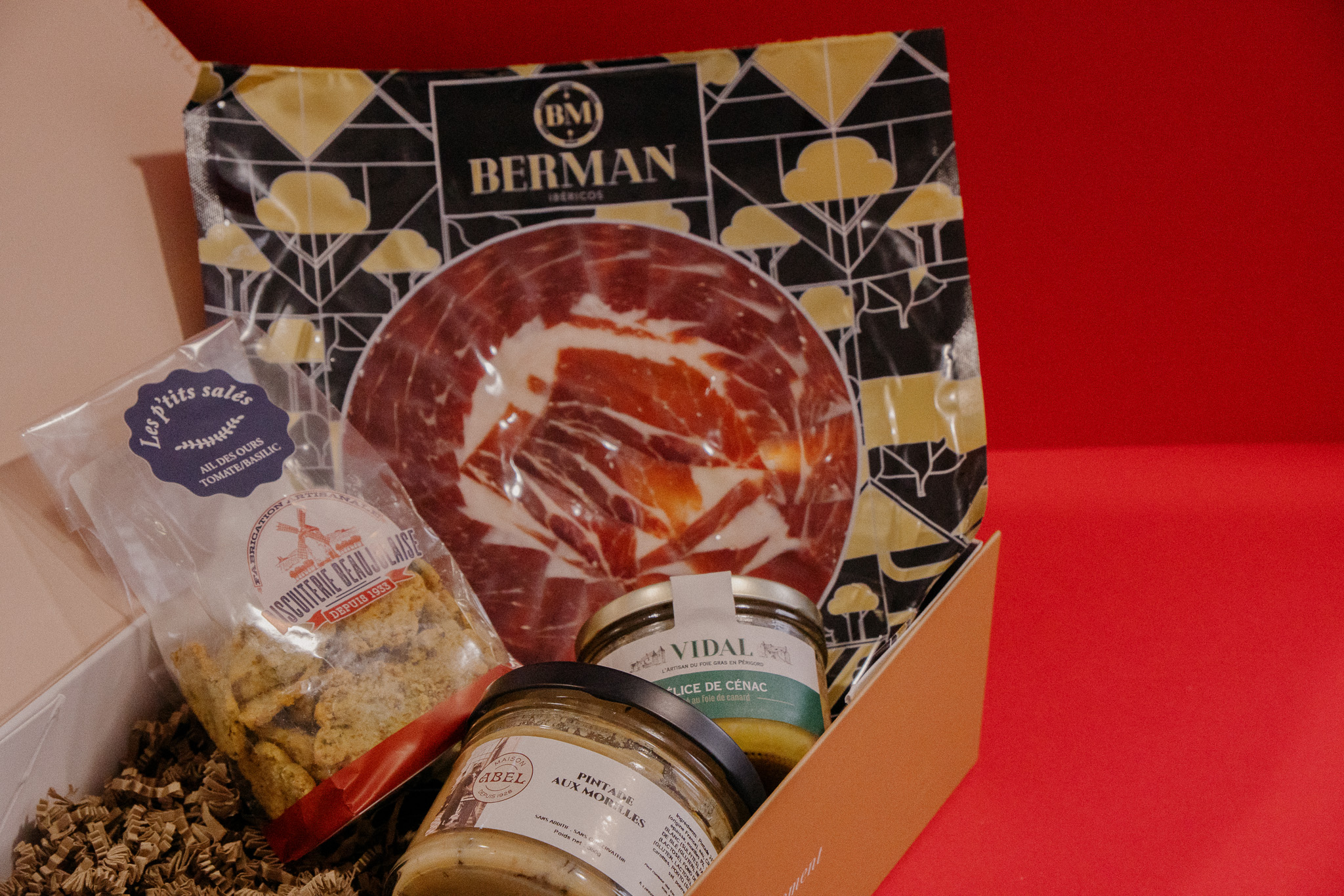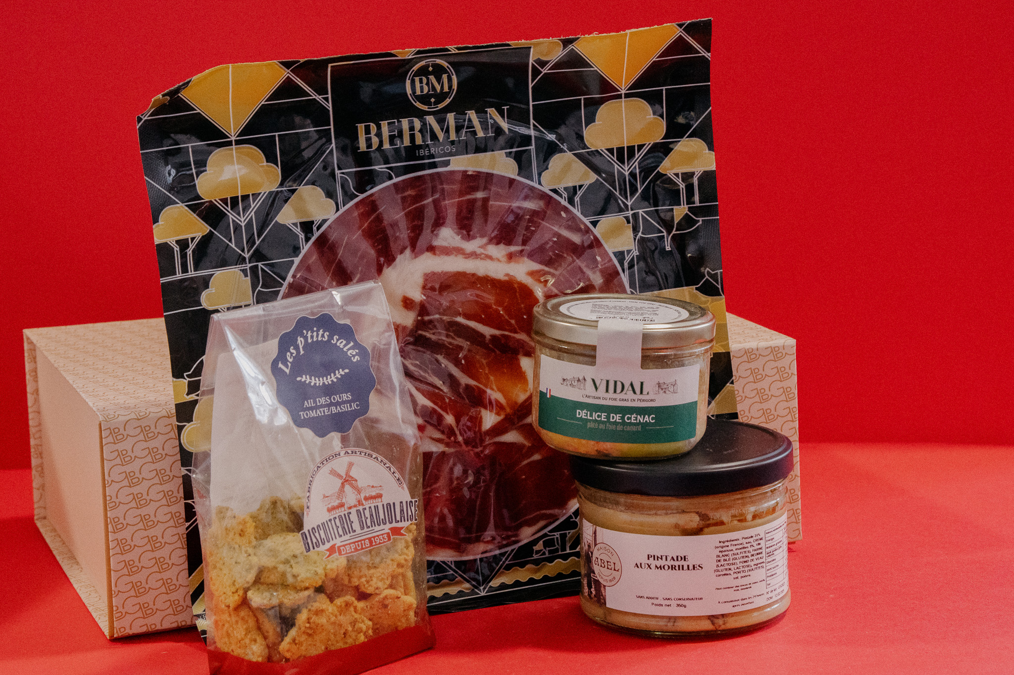 D'un délice de Cénac Maison Vidal en Périgord (170 gr), d'un sachet de biscuits apéritifs Biscuiterie Beaujolaise (160gr), d'un jambon Bellota 75% Ibérique Maison BERMAN (100gr) et d'une pinntade aux morilles de la Maison Abel (350gr)