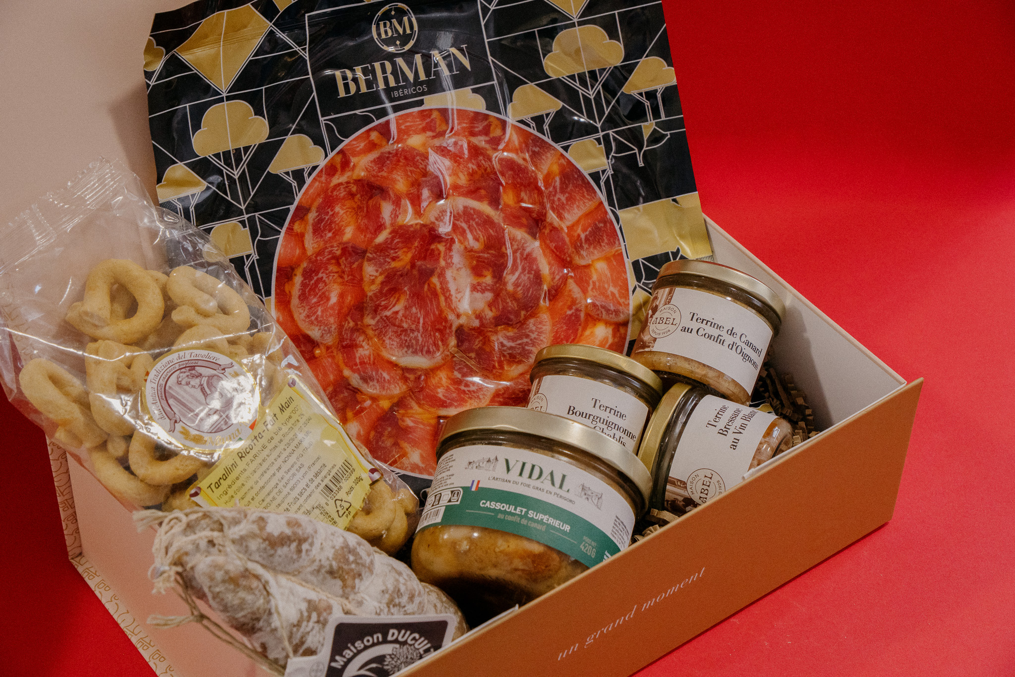 D'une asiette de lomo Ibérique Maison Berman (100gr), d'un trio de terrines de la maison (Abel 90gr), d'un Jesus - Maison Duculty, d'un tarralini à la ricotta Olio Di Serra (300gr), d'un cassoulet de canard Maison Vidal en Périgord (420gr).