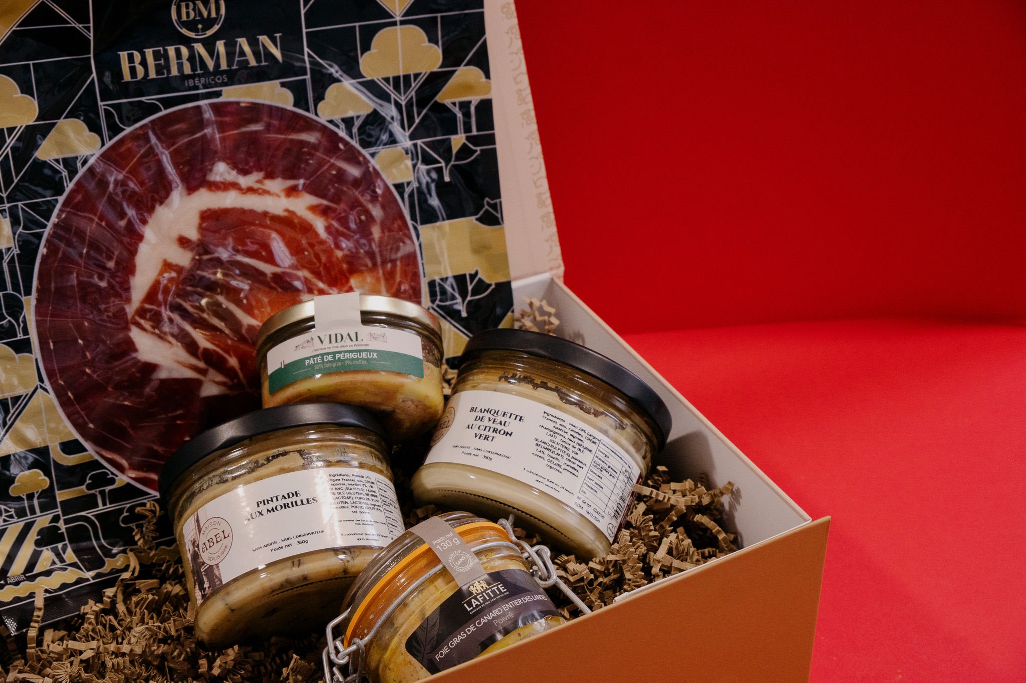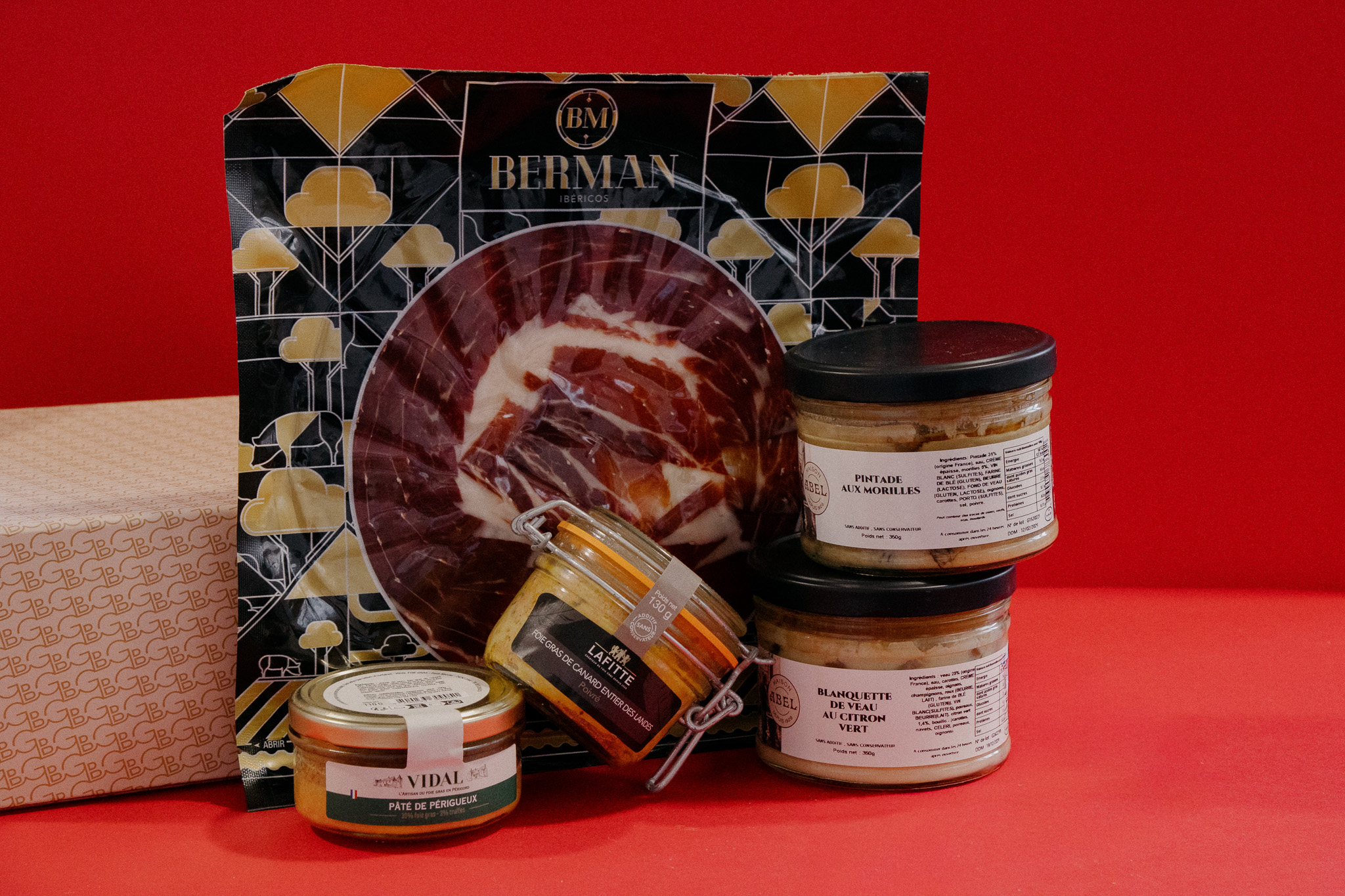 D'un foie gras entier bocal Maison Lafitte (130gr), d'un jambon Bellota 75% Ibérique Maison BERMAN (100gr), d'un pâté Périgueux truffe et foie gras de canard du Périgord (110gr), d'une pintade aux morilles de la Maison Abel (350gr), d'une blanquette de veau de la maison Abel 350gr.
