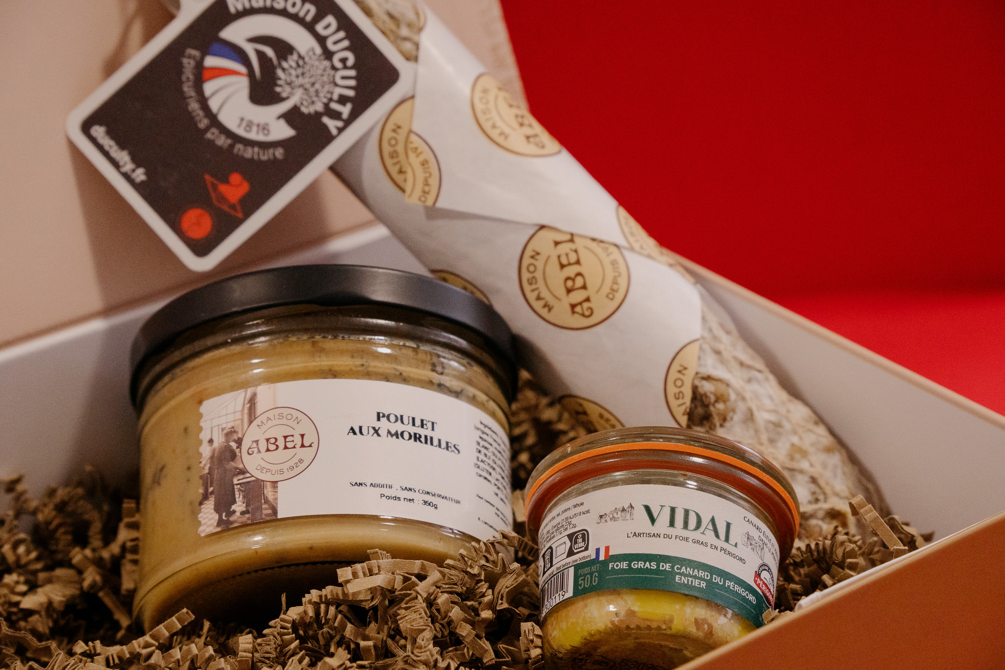 D'une rosette de Lyon - Maison Duculty, d'un foie gras entier Maison Vidal Périgord (50gr) et d'un poulet aux morilles de la maison Abel (350gr)