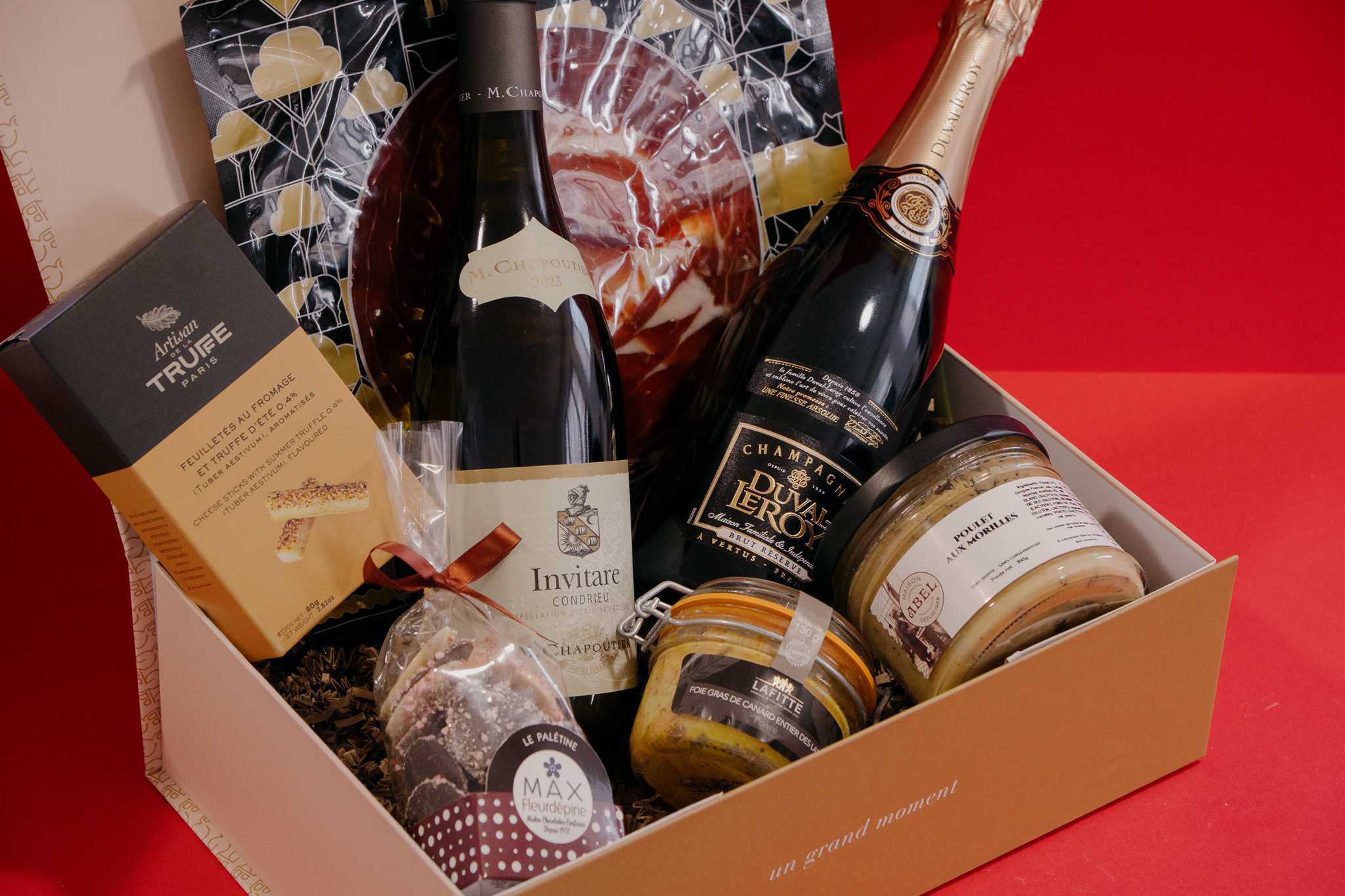 D'une bouteille de Champagne Duval-Leroy brut réserve 75cl, d'un condrieu Invitare Maison Chapoutier 2023 75cl, d'un foie gras bocal Maison Lafitte (130gr), d'un jambon Bellota 75% Ibérique Maison BERMAN (100gr), d'un poulet aux morilles de la maison Abel (350gr), de feuilletés à la truffe d'été (80gr), d'une palétine aux éclats de pralines Maison de la praline (150gr). (Photo non contractuelle).